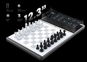 Its 12.3-inch touchscreen display (1920×720) shows moves, analyses, and visual aids in real time. Thanks to full piece recognition, setup is instantaneous — simply place the pieces on the board to start playing.